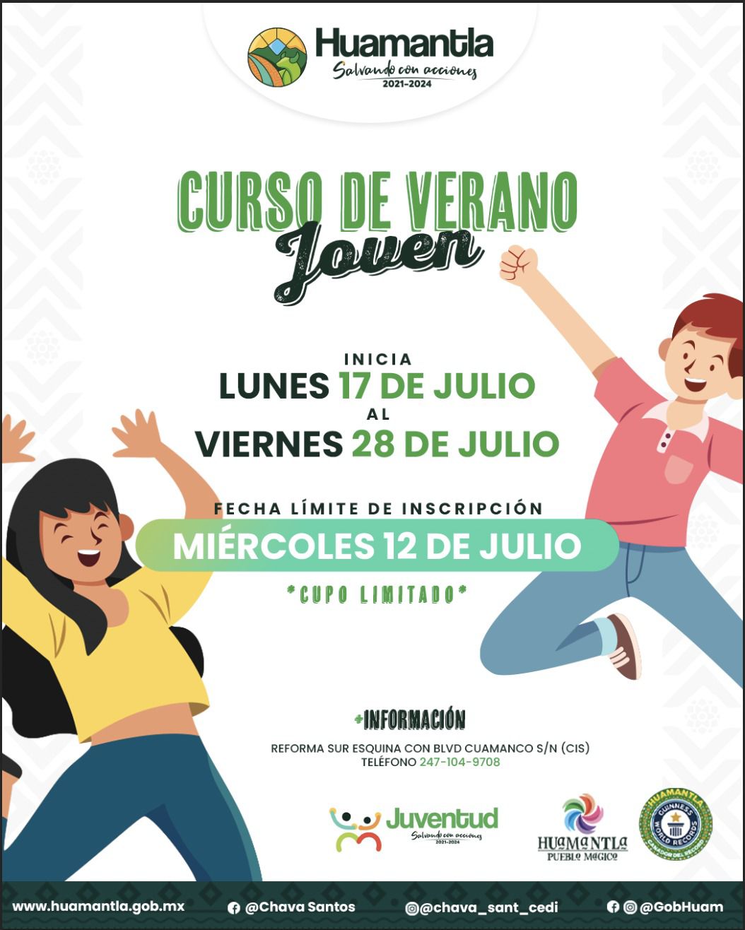 El H. Ayuntamiento de Huamantla que preside Salvador Santos Cedillo, a travรฉs de la Coordinaciรณn de Juventud, invita al Curso de Verano Joven, totalmente gratuito, del 17 al 28 de julio, con actividades recreativas, culturales, deportivas y artรญsticas.