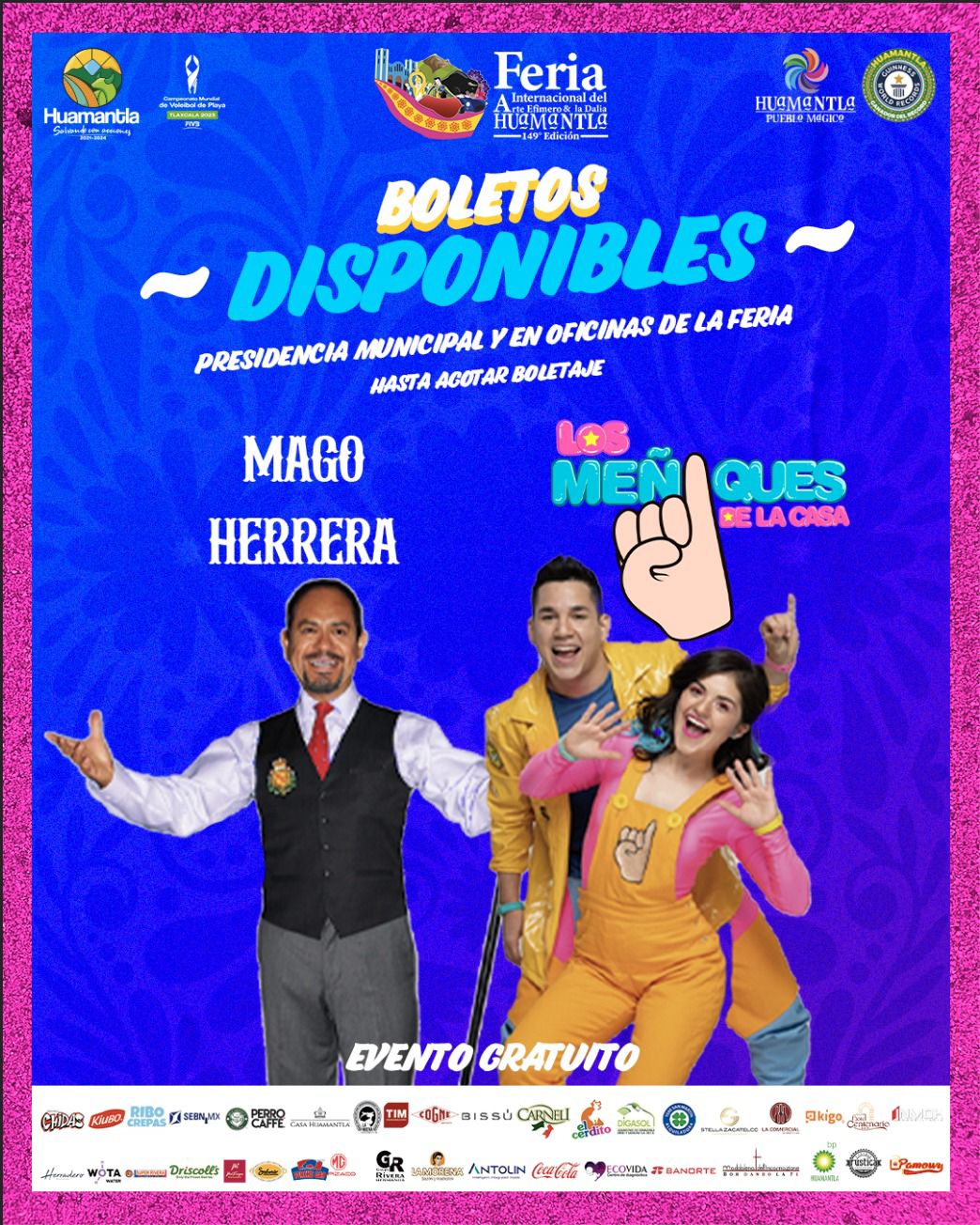 El H. Ayuntamiento de Huamantla que preside Salvador Santos Cedillo, en el marco de la Feria Internacional del Arte Efímero y la Dalia 2023, informa que los días 29 y 30 de agosto podrán adquirir de manera gratuita los boletos para disfrutar del espectáculo infantil en el Foro del Artista con Los Meñiques de la Casa y el Mago Herrera.