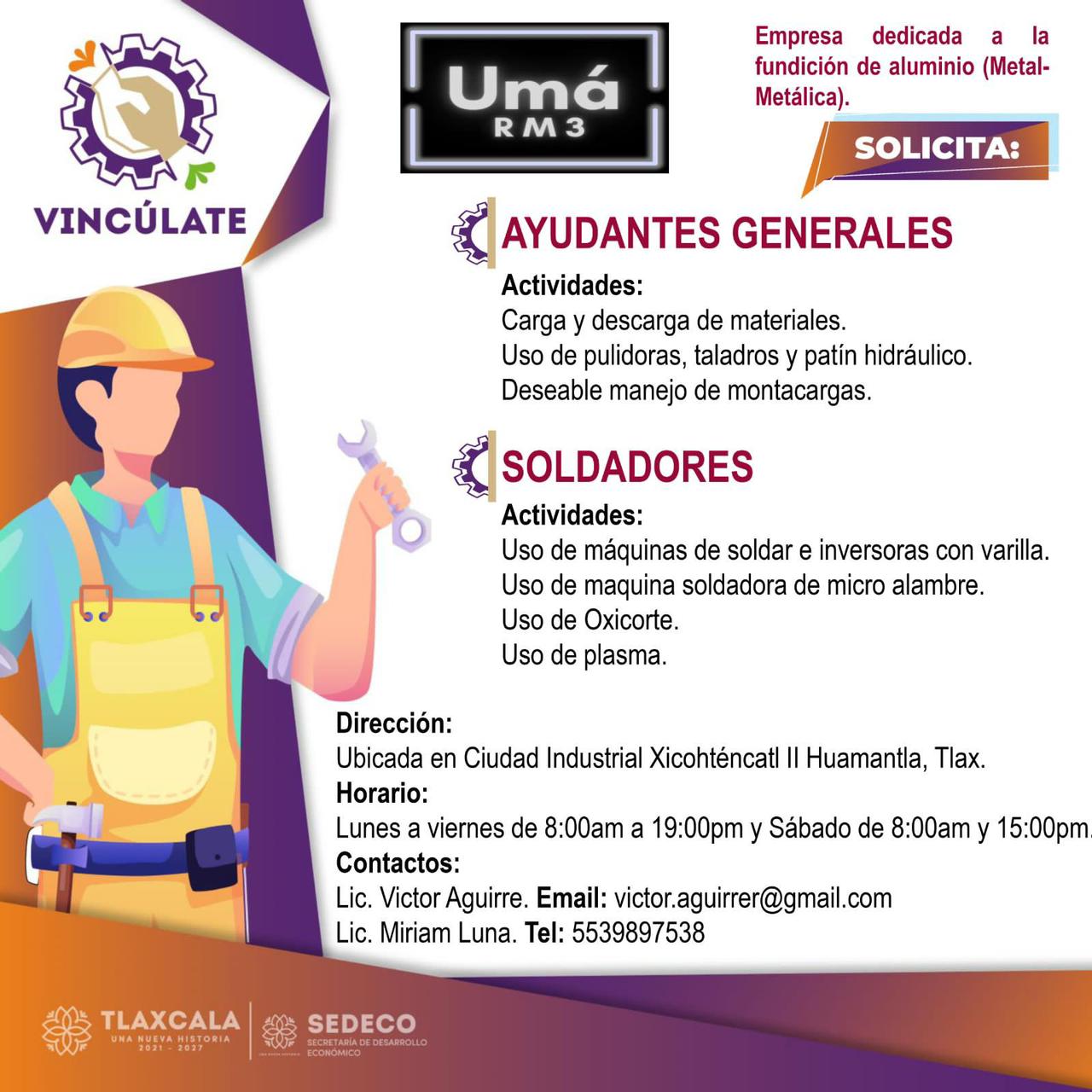 El H. Ayuntamiento de Huamantla, a través de su Coordinación de Desarrollo Económico, con el apoyo del gobierno del estado y la Secretaría de Desarrollo Económico, anuncian que la Empresa UMÁ RM3, ubicada en la Ciudad Industrial Xicohténcatl II, brindará oportunidades de empleo a las y los huamantlecos que cumplan con las habilidades solicitadas.