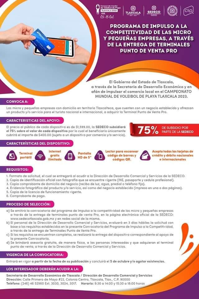 Con el propósito de elevar la competitividad de los comercios locales, el H. Ayuntamiento de Huamantla, invita a todos los empresarios, artesanos, comerciantes o prestadores de servicios, a participar en la estrategia de la Secretaría de Desarrollo Económico (Sedeco) de Tlaxcala, para adquirir una “Terminal Punto de Venta Pro” a bajo costo.