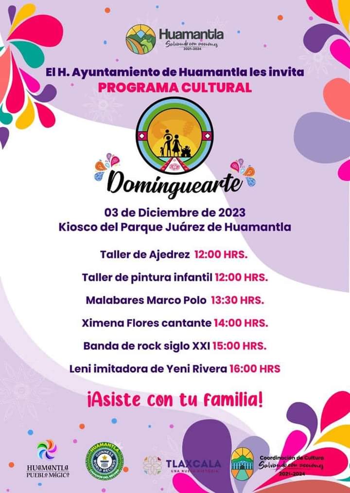 Huamantla, Tlax.,.03 de diciembre 2023| Como parte de las actividades culturales, este primer domingo de diciembre se llevará a cabo una edición más del “Dominguearte”, el programa que impulsa el H. Ayuntamiento de Huamantla, mismo que se ha convertido en un escenario principal para artistas y grupos musicales locales.