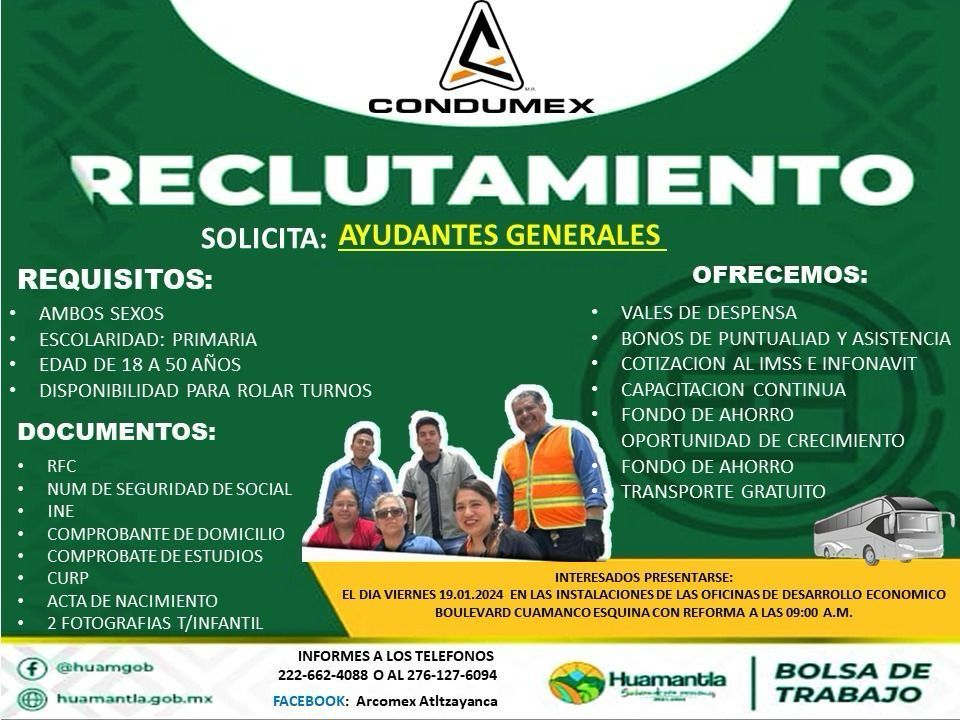 𝙷𝚞𝚊𝚖𝚊𝚗𝚝𝚕𝚊, 𝚃𝚕𝚊𝚡., 17 𝚍𝚎 𝚎𝚗𝚎𝚛𝚘 2024|El H. Ayuntamiento de Huamantla, que preside Salvador Santos Cedillo, en colaboración con la empresa Condumex, especializada en la producción de cables de extra alta tensión, anuncia que llevará a cabo un reclutamiento para contratar a ayudantes generales este viernes 19 de enero a las 9:00 horas.