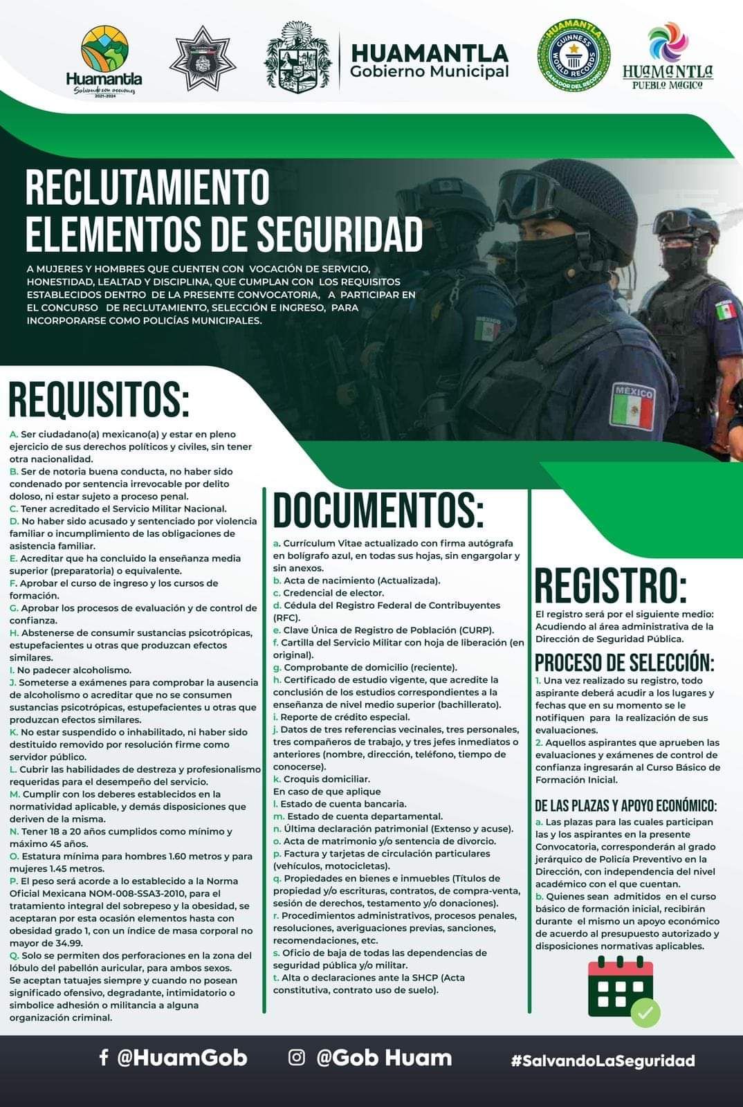 Para participar en dicha convocatoria, los interesados deberรกn presentarse en las oficinas de la Direcciรณn de Seguridad Pรบblica de Huamantla y dejar los siguientes documentos: Currรญculum Vitae, Acta de Nacimiento, Credencial de Elector, Cartilla Militar, Cรฉdula del Registro Federal de Contribuyentes, entre otros.