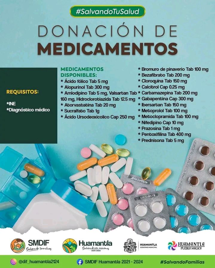 La directora del DIF Huamantla, Teresa Ramรญrez Cรณdiz, informรณ que se tienen los siguientes medicamentos a disposiciรณn: รกcido fรณlico Tab 5 mg., Alopurinol Tab 300 mg., Amlodipino Tab 5 mg., Valsartan Tab 160 mg., Hidrocortisona Tan 12.5 mg., Atorvastatina Tab 20 mg., Sucralfato Tab 1g., รcido Ursodeoxicรณlico Cap 250 mg., Bromuro de pinaverio Tab 100 mg., Bezafibrato Tab 200 mg., Cloroquina Tab 150 mg., Calcitriol Cap 0.25 mg., Carbamazepina Tab 200 mg., Gabapentina Cap 300 mg., Irbesartan Tab 150 mg., Metoprolol Tab 100 mg., Metoclopramida Tab 100 mg., Nifedipino Cap 10 mg., Prazosina Tab 1 mg., Pentoxifilina Tab 400 mg. y Prednisona Tab 5 mg.