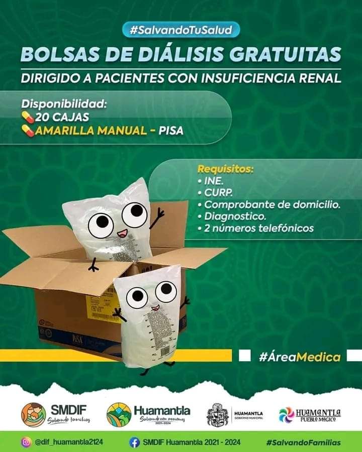 El Sistema Municipal para el Desarrollo Integral de la Familia (SMDIF) de Huamantla, a travรฉs del programa โSalvando tu Saludโ, invita a la ciudadanรญa a adquirir bolsas de diรกlisis gratuitas, dirigido a pacientes con insuficiencia renal a fin de contribuir en su tratamiento y economรญa familiar.