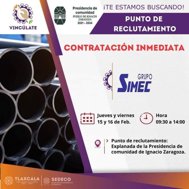 El H. Ayuntamiento de Huamantla, encabezado por Salvador Santos Cedillo, en colaboración con el Grupo Simec, anuncia una oportunidad de empleo con contratación inmediata.