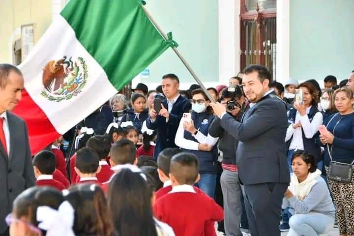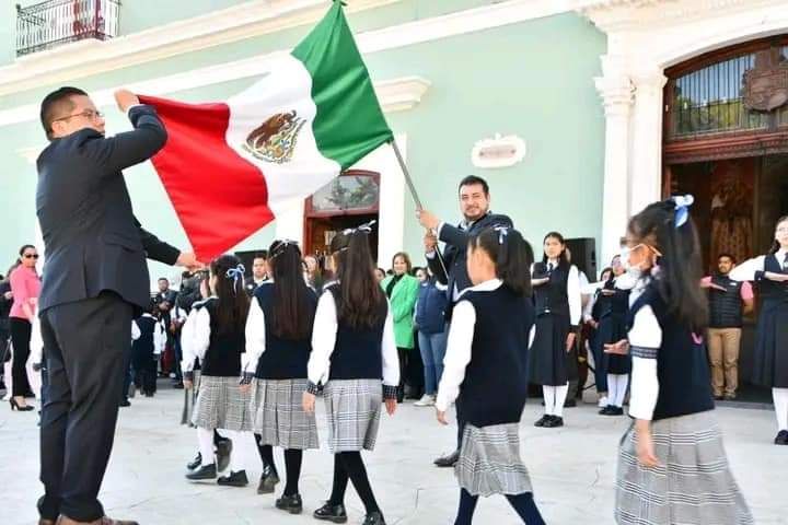 Frente a la Presidencia Municipal, el Edil Salvador Santos, reconociรณ la importancia de fomentar, desde pequeรฑos, el amor y respeto a los sรญmbolos patrios, ya que representan el trabajo en equipo y el valor de quienes lucharon por la soberanรญa todos los mexicanos.