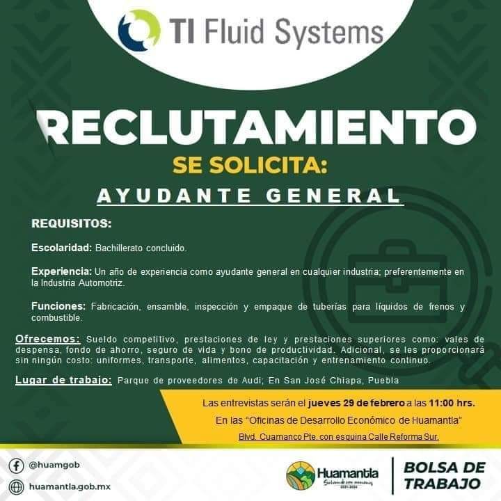 El H. Ayuntamiento de Huamantla, que preside Salvador Santos Cedillo, en colaboración con la empresa TI Fluid Systems del ramo automotriz, anuncia que realizará un reclutamiento para contratar a personal como ayudantes generales, este jueves 29 de febrero.