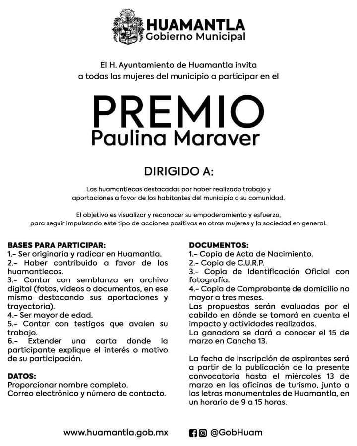 El gobierno municipal de Huamantla invita a las mujeres del Pueblo Mรกgico a participar en la ediciรณn 2024 del Premio โ€œPaulina Maraverยป, galardรณn que busca reconocer y exaltar por tercer aรฑo consecutivo la labor de las huamantlecas que han contribuido significativamente al bienestar y desarrollo de los habitantes de la localidad.