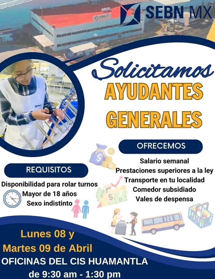 El H. Ayuntamiento de Huamantla, en colaboración con la empresa SEBN MX, anuncia que realizará un reclutamiento para contratar a personal como ayudantes generales, este lunes 8 y martes 8 de abril.