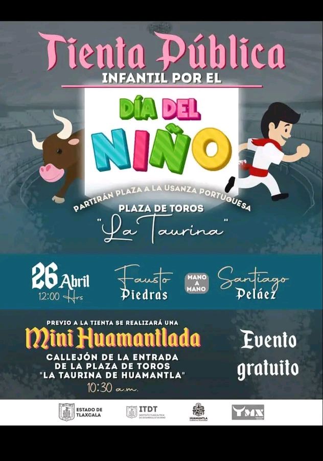 El espíritu festivo del Día del Niño se combina con la pasión por la tauromaquia en una celebración especial organizada por el Gobierno Municipal de Huamantla en colaboración con el Instituto Tlaxcalteca de Desarrollo Taurino (ITDT), por lo que se invita a todos los niños de Huamantla a participar en la Tienta Pública Infantil, que se llevará a cabo el próximo 26 de abril en la Plaza de Toros «La Taurina» a las 12:00 horas.