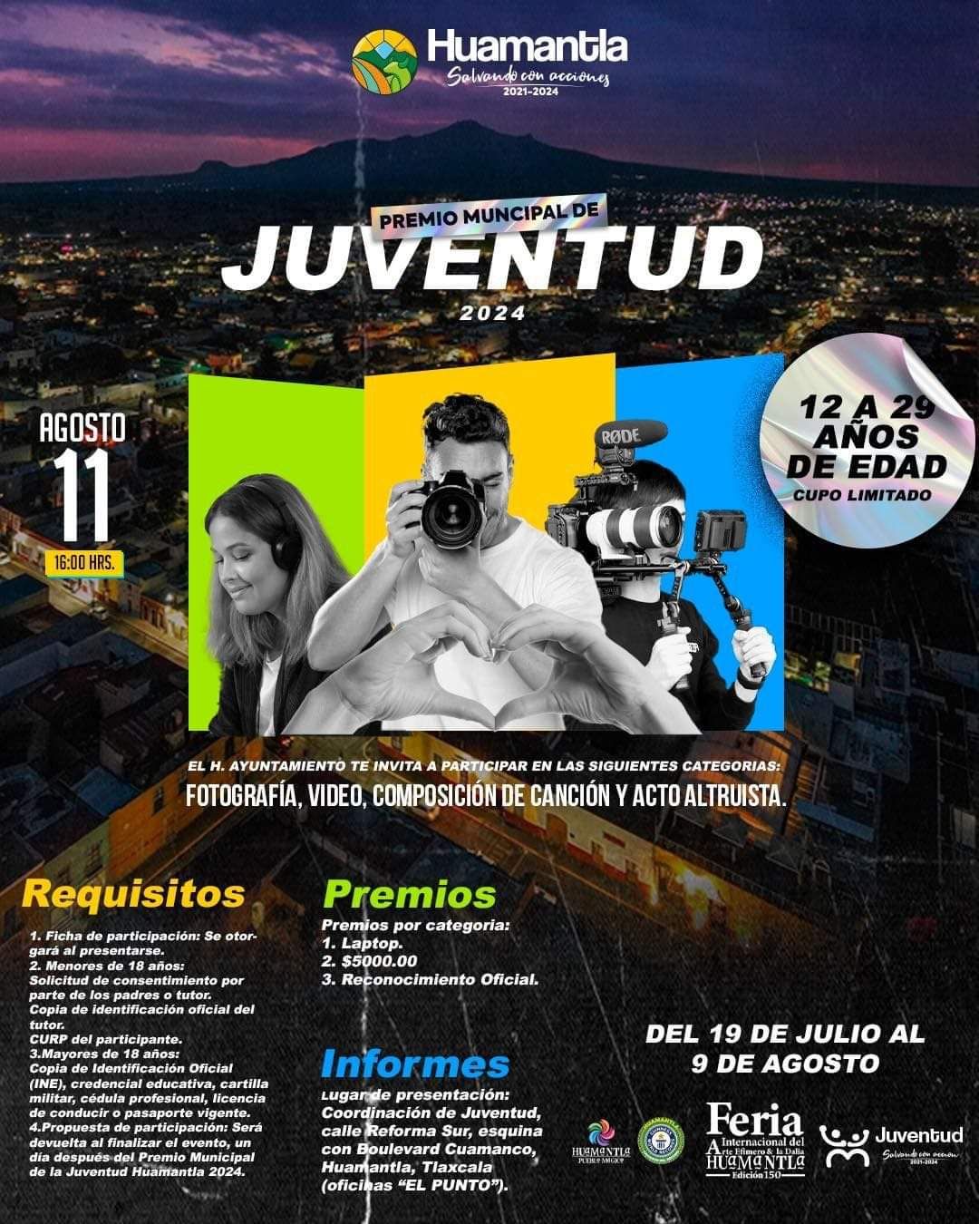 El H. Ayuntamiento de Huamantla convoca a las y los jóvenes del municipio a participar en el Premio Municipal de Juventud 2024, en el marco de la Feria Internacional del Arte Efímero y la Dalia.