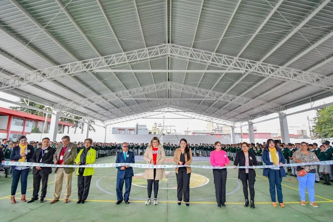 Entregan autoridades municipales la construcciรณn de una techumbre y canchas de usos mรบltiples en la escuela Secundaria General Justo Sierra.