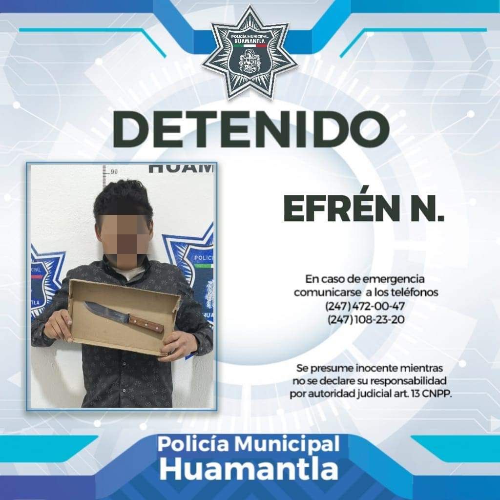 Elementos de la Direcciรณn de Seguridad Pรบblica de Huamantla lograron la detenciรณn de un hombre, identificado como Efrรฉn N., quien portaba un arma blanca de grandes dimensiones y mostraba una actitud violenta, lo que representaba un peligro para cualquier persona que se encontrara en su camino.