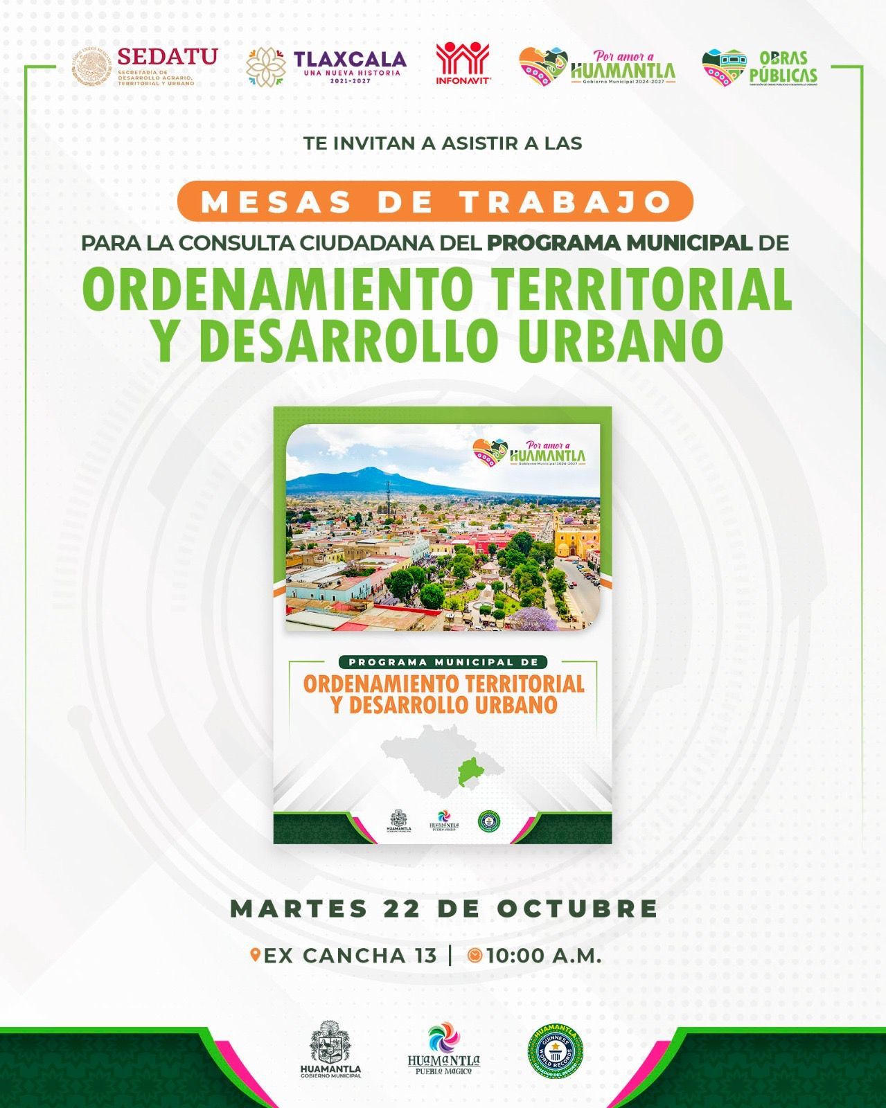 El Ayuntamiento de Huamantla, presidido por Salvador Santos Cedillo, a travรฉs de la Direcciรณn de Obras Pรบblicas y Desarrollo Urbano, invita a toda la ciudadanรญa a participar en las mesas de trabajo del Programa Municipal de Ordenamiento Territorial y Desarrollo Urbano, que se llevarรกn a cabo este martes 22 de octubre, a las 10:00 horas en el Auditorio de la Ex Cancha Trece.