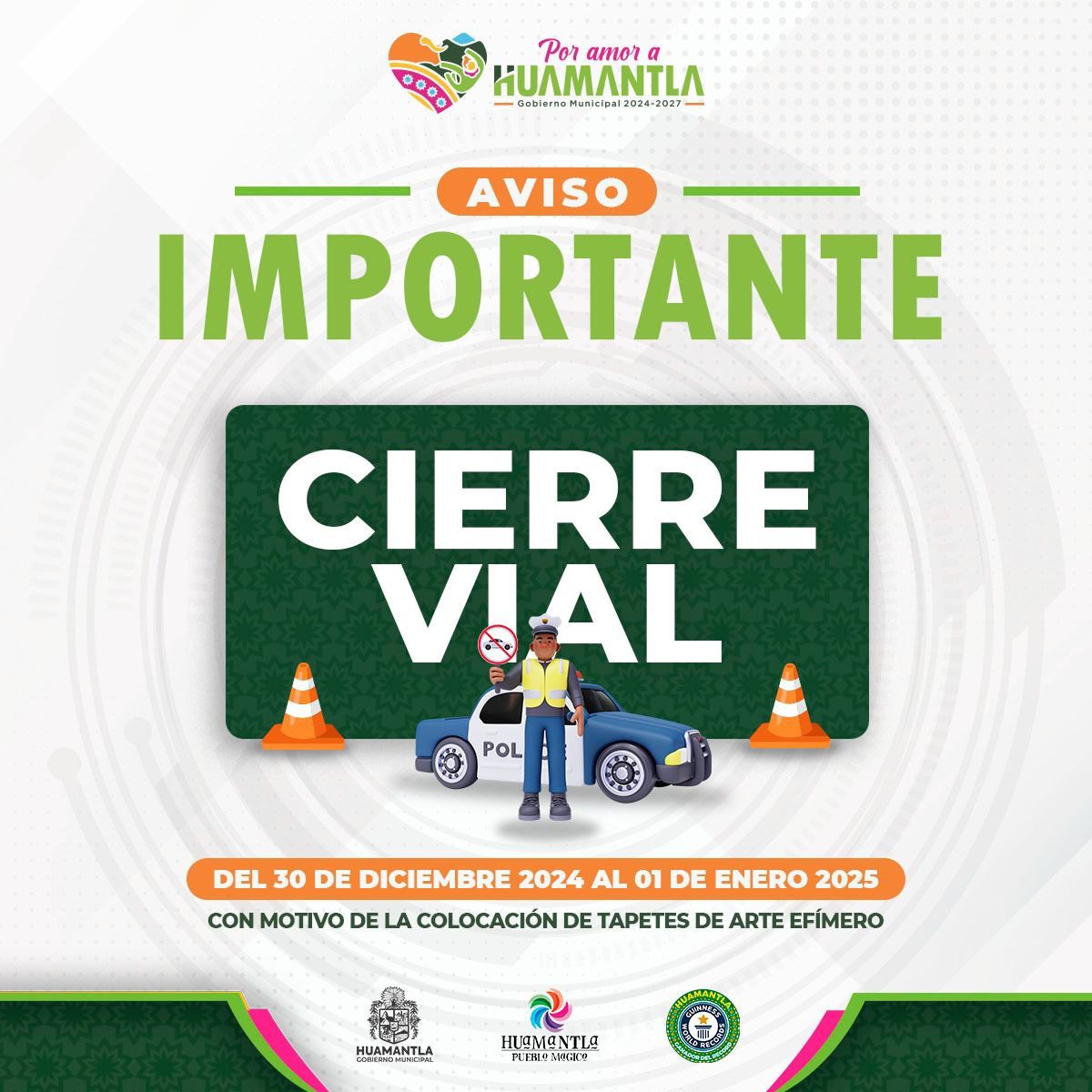 29/12/2024| ๐ฆบ๐ฎโโ๏ธ๐ซA partir de este lunes 30 de diciembre comenzarรก el cierre de las calles en las que los artesanos del Pueblo Mรกgico crearรกn tapetes y alfombras, como parte de la celebraciรณn en honor al Seรฑor del Convento, por lo que el Gobierno Municipal de Huamantla invita a la poblaciรณn en general y a los visitantes a planificar sus traslados y tomar rutas alternas para evitar contratiempos.
