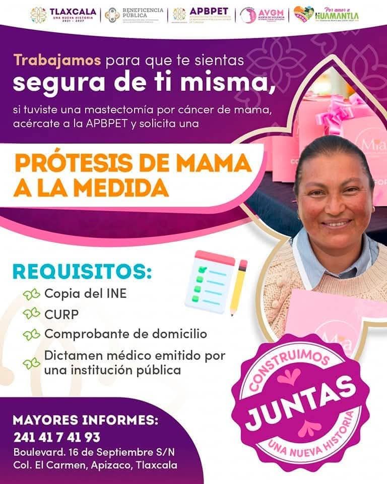 20/02/2025| 💓👩El Sistema Municipal para el Desarrollo Integral de la Familia (SMDIF) Huamantla, en colaboración con la Administración del Patrimonio de la Beneficencia Pública del Estado de Tlaxcala (APBPET), invita a las mujeres huamantlecas que han pasado por una mastectomía debido al cáncer, a participar en el programa sin costo “Prótesis de mama a la medida”.
