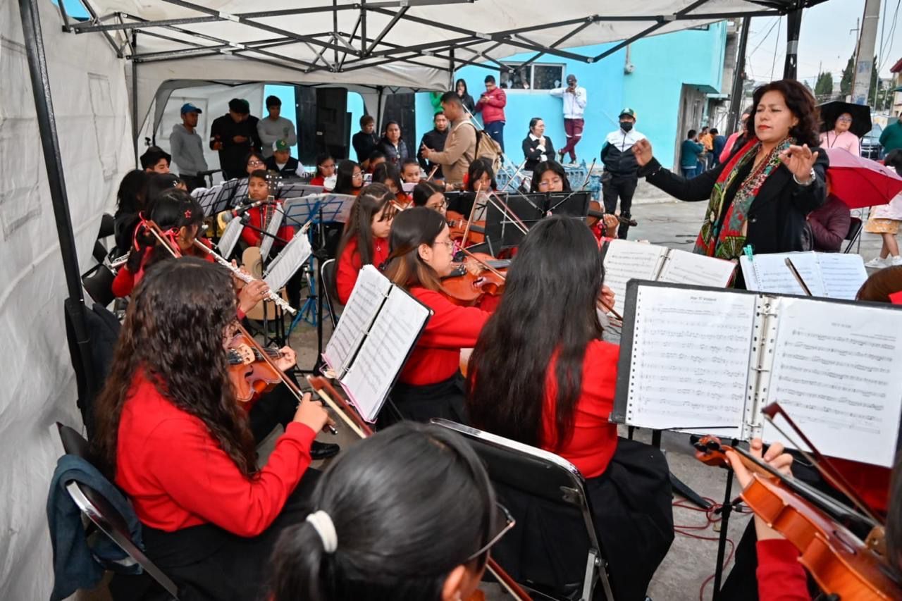 Apenas este viernes, por gestiรณn del Ayuntamiento, a travรฉs de la Coordinaciรณn de Cultura, la orquesta se presentรณ en San Sebastiรกn, donde las niรฑas, niรฑos y adolescentes mostraron su talento en la ejecuciรณn de diversos instrumentos que alegraron la tarde y atrajeron el interรฉs de las familias que acudieron a disfrutar de los tradicionales muรฉganos.