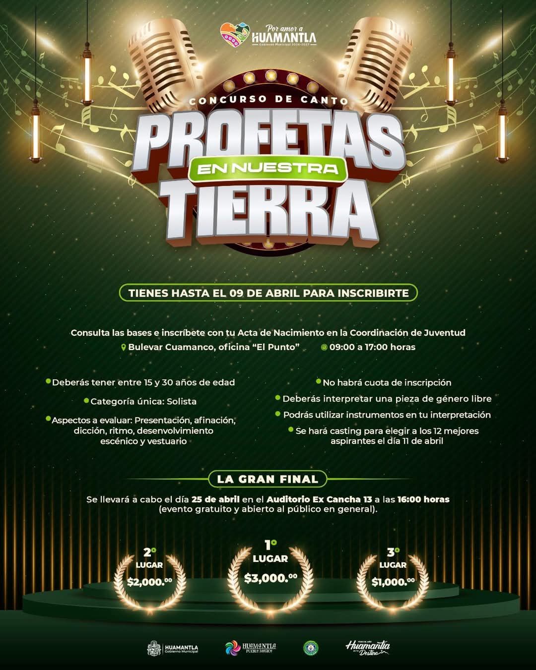 31|MAR|2025|El Gobierno del Municipio de Huamantla, a travรฉs de la Direcciรณn de Bienestar y la Coordinaciรณn de Juventud, convoca al concurso de canto โ€œProfetas en Nuestra Tierraโ€ para impulsar el talento de los jรณvenes y fomentar la cultura en este Pueblo Mรกgico.