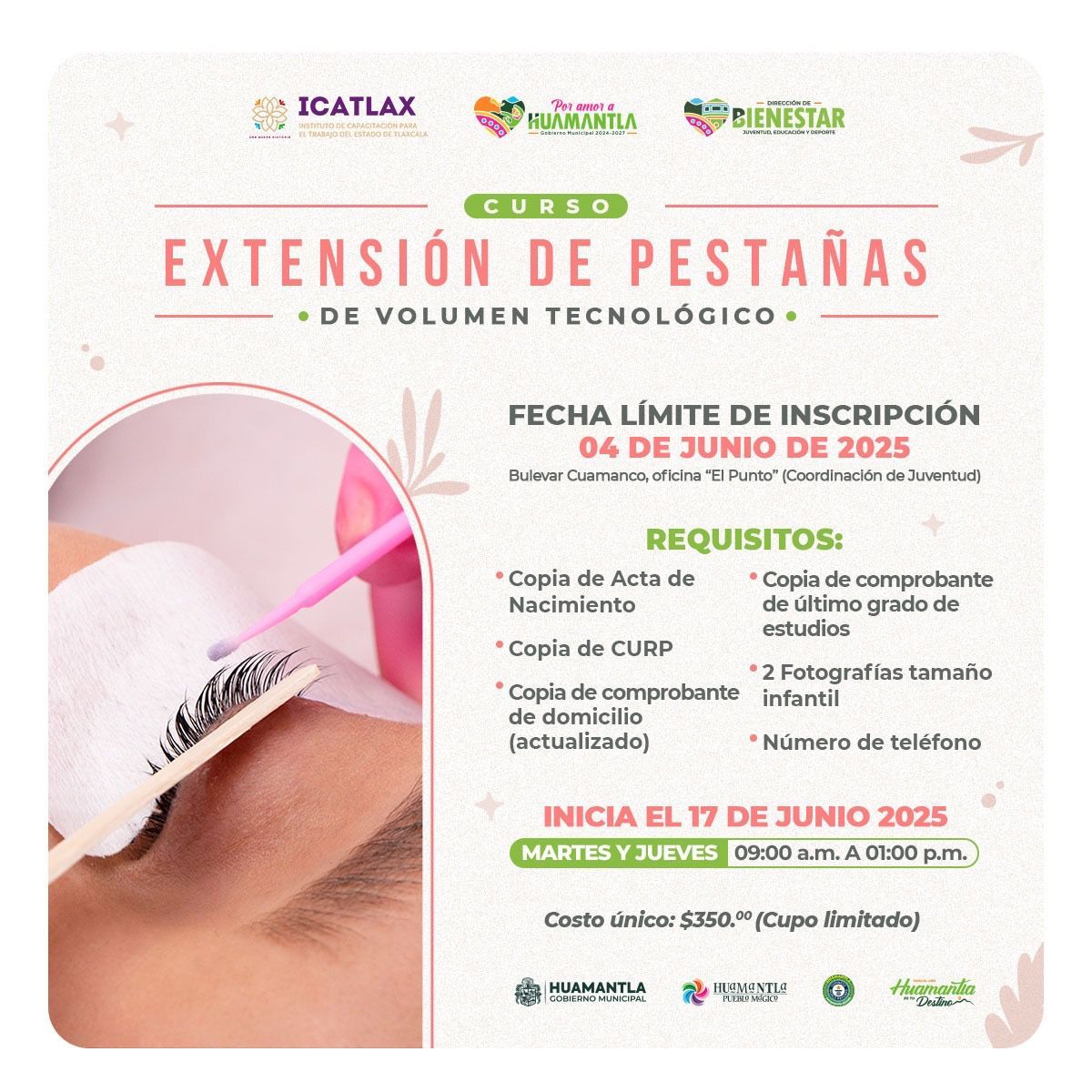 29/MAYO/2025| Como una forma de generar oportunidades de autoempleo para la ciudadanΓ­a, el Gobierno Municipal de Huamantla, que encabeza Salvador Santos Cedillo, en coordinaciΓ³n con el Instituto de CapacitaciΓ³n para el Trabajo del Estado de Tlaxcala (ICATLAX), invita a la poblaciΓ³n interesada a participar en el curso Β«ExtensiΓ³n de PestaΓ±as de Volumen TecnolΓ³gicoΒ», el cual iniciarΓ‘ el prΓ³ximo 17 de junio.