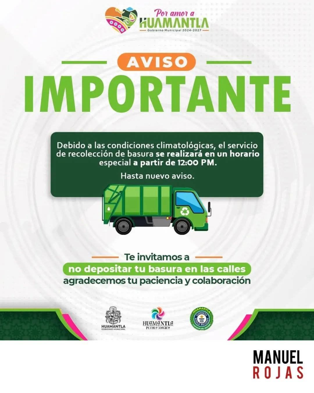 Agradecemos su comprensiรณn y colaboraciรณn para mantener limpio nuestro municipio. Esta medida se mantendrรก mientras persistan las lluvias.