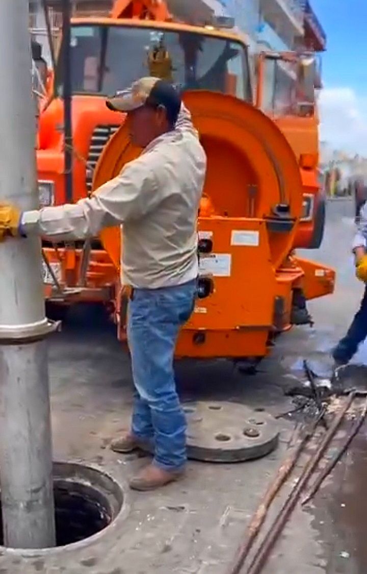 Personal de ๐๐๐ฃ๐๐ ๐ se encuentra realizando labores de desazolve de drenaje en la calle Morelos Oriente y Allende Norte, con el objetivo de prevenir encharcamientos, obstrucciones y riesgos sanitarios en la zona.
