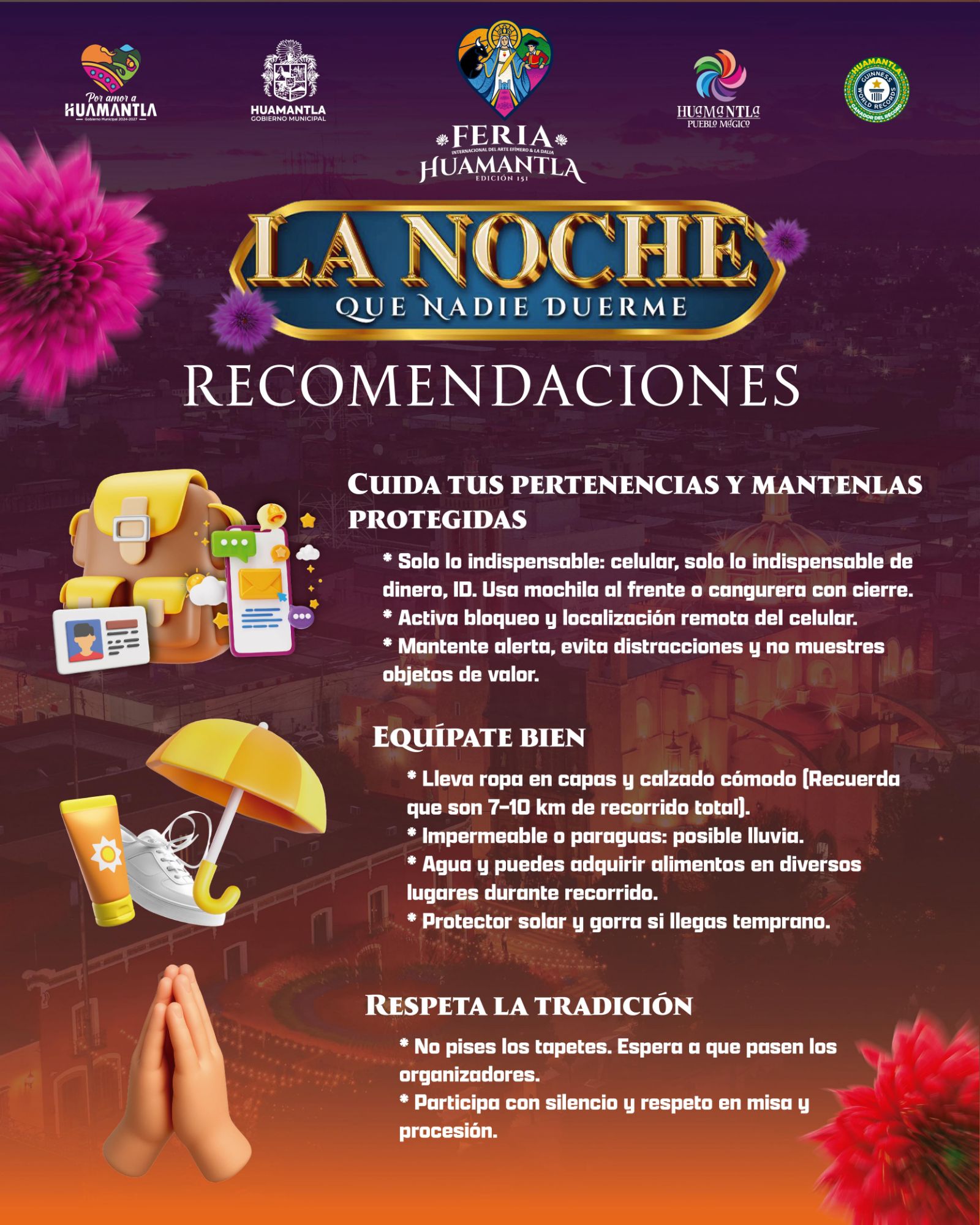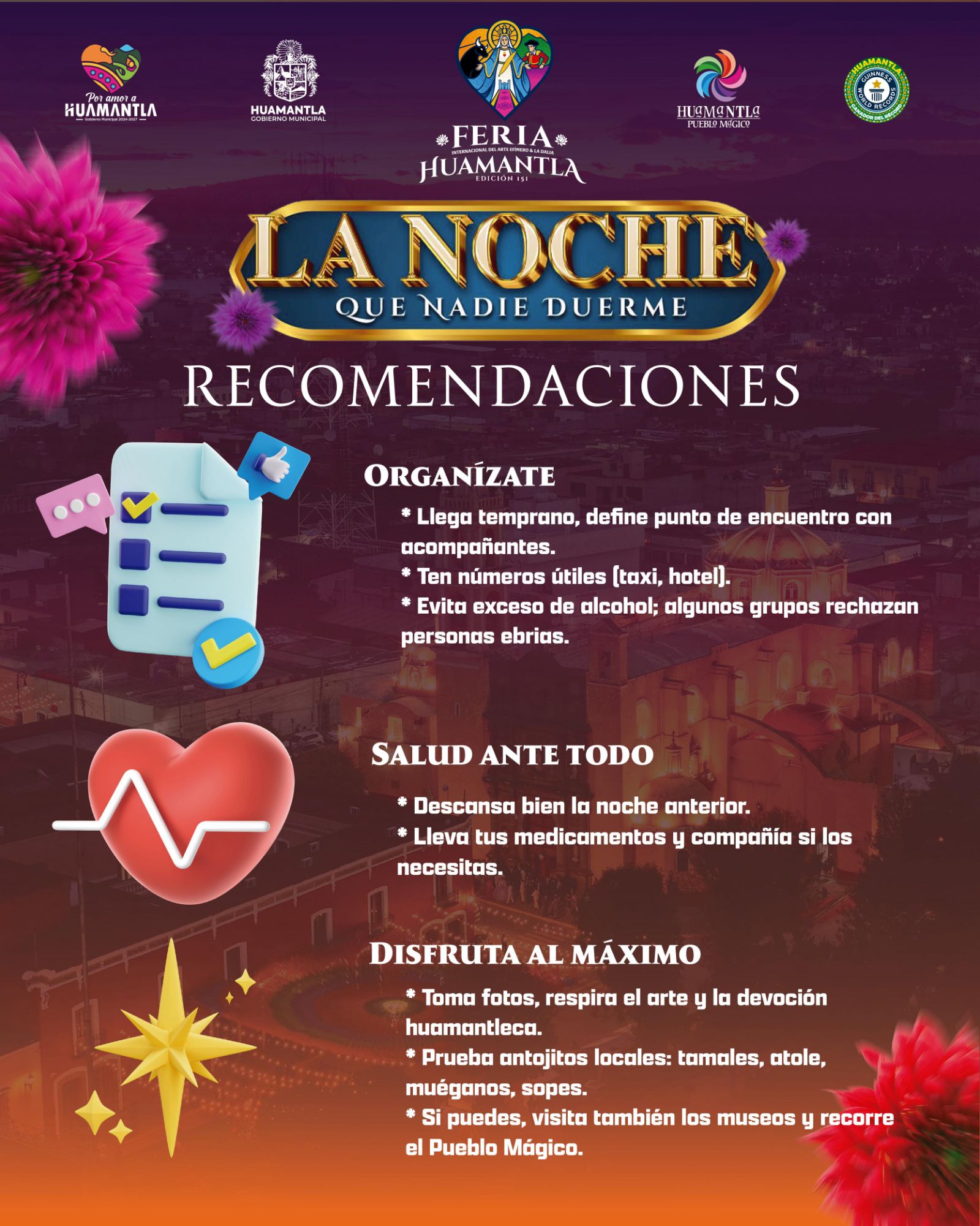 14/08/2025|Con el objetivo de que habitantes y visitantes vivan de manera plena y segura la Noche que Nadie Duerme, el Gobierno Municipal de Huamantla, que preside Salvador Santos Cedillo, emitiรณ una serie de recomendaciones para prevenir incidentes durante este evento que congrega a miles de personas en el Pueblo Mรกgico.