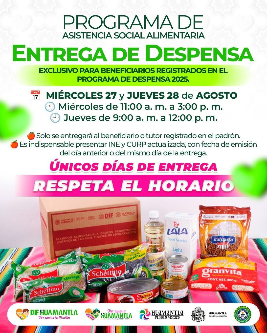 El Sistema Municipal para el Desarrollo Integral de la Familia (SMDIF) Huamantla informa a las y los beneficiarios del Programa de Asistencia Social Alimentaria que la entrega de despensas correspondiente al mes de agosto se realizarรก los dรญas miรฉrcoles 27 de agosto, en un horario de 11:00 a.m. a 3:00 p.m. Y el jueves 28 de agosto de 9:00 a.m. a 12:00 p.m en sus instalaciones ubicadas en calle Fernando Hernรกndez Carrasco 101, Barrio San Josรฉ.