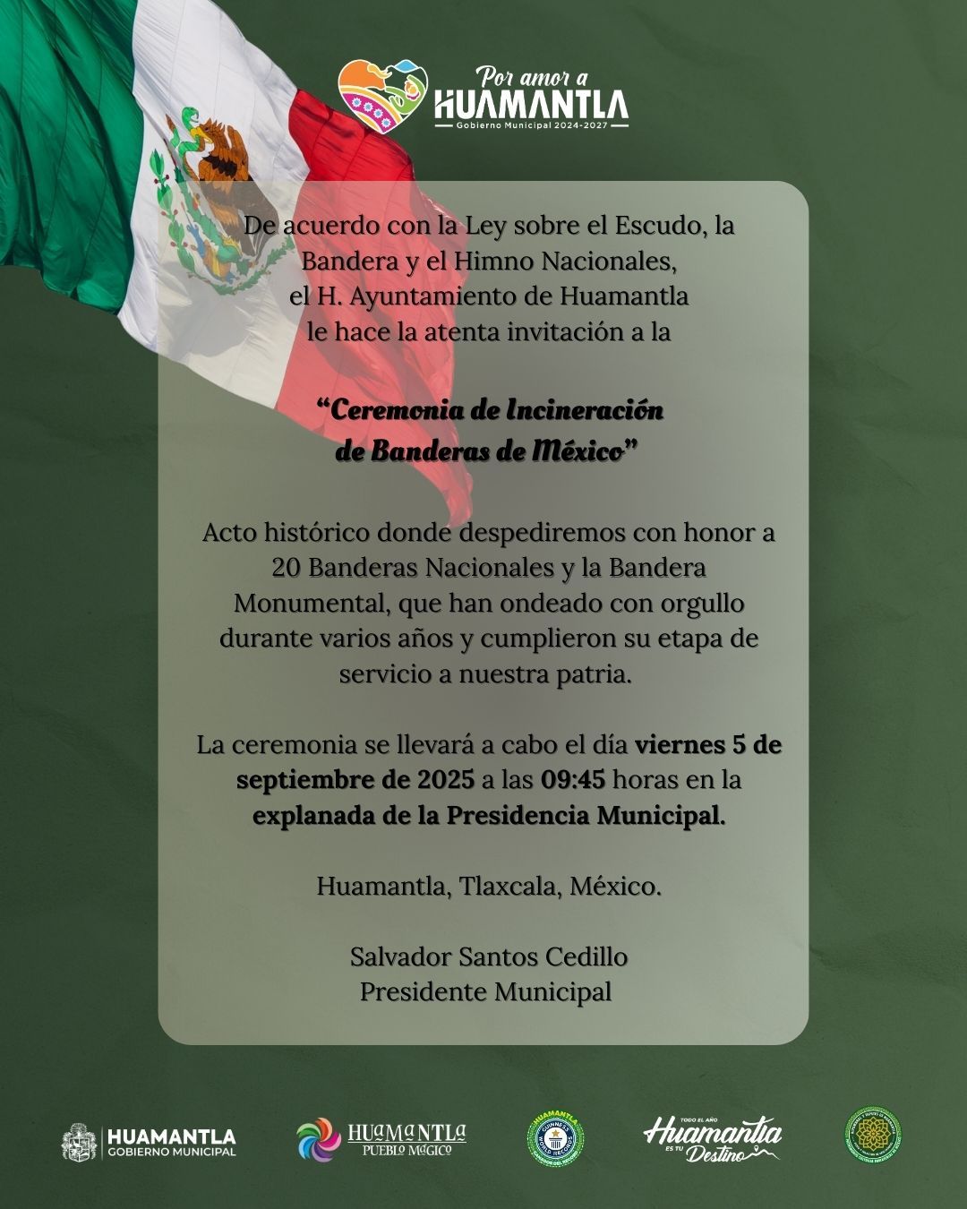 En cumplimiento con la Ley sobre el Escudo, la Bandera y el Himno Nacionales, el Ayuntamiento de Huamantla invita a toda la ciudadanรญa a participar en la Ceremonia de Incineraciรณn de Banderas de Mรฉxico, un acto solemne en el que se rendirรก homenaje a los sรญmbolos patrios.
