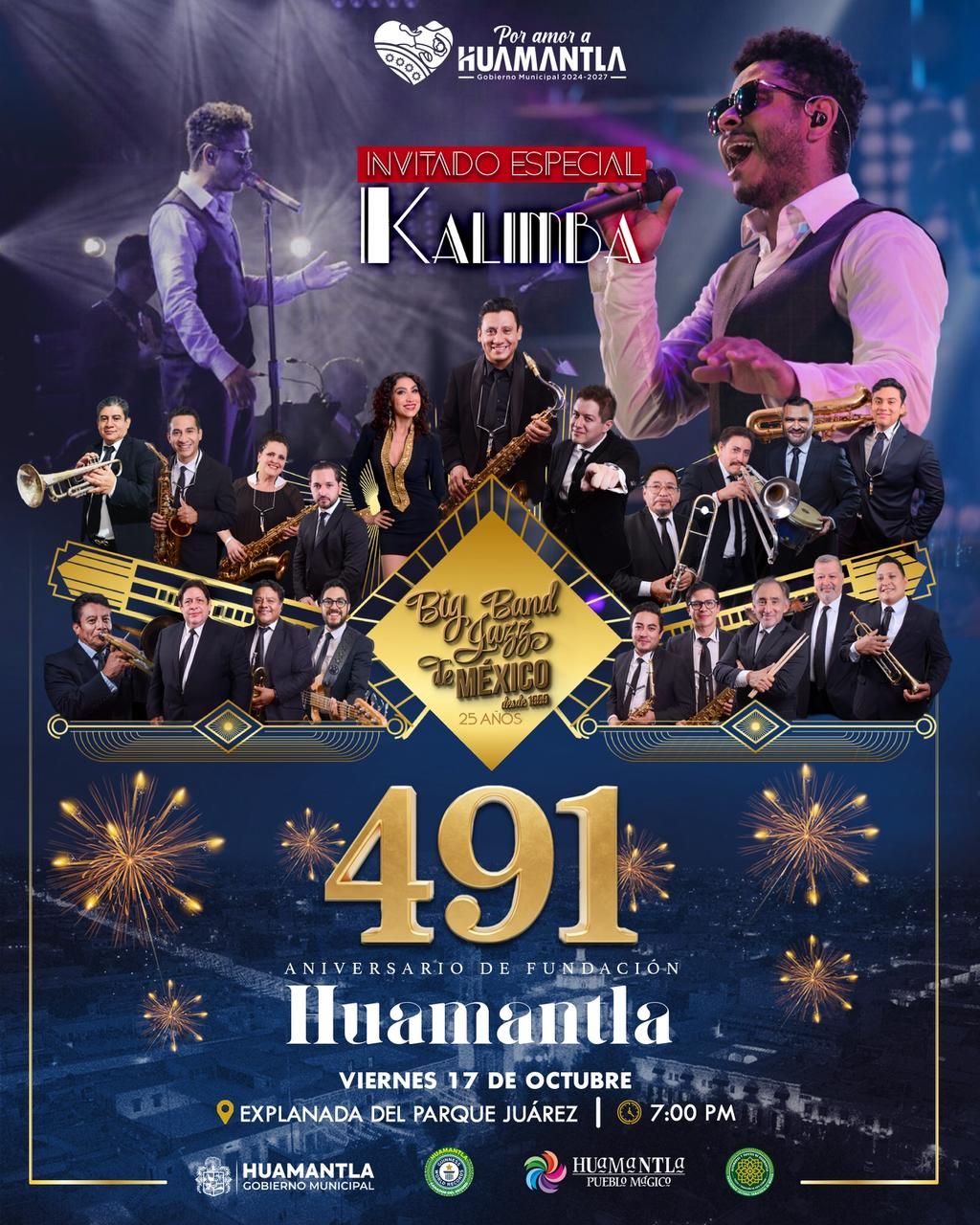 ๐ถ Como evento especial, el viernes 17 de octubre, Huamantla vivirรก una noche inolvidable con la presentaciรณn de la Big Band Jazz de Mรฉxico, una de las agrupaciones mรกs reconocidas del paรญs, que llegarรก acompaรฑada del talentoso cantante Kalimba, quien serรก el invitado especial de esta gran celebraciรณn musical.