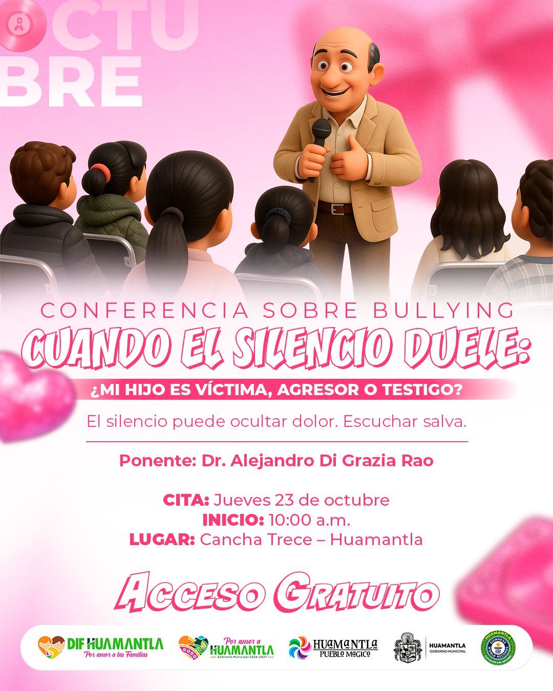 Con el propรณsito de fomentar entornos mรกs seguros y libres de violencia, el Ayuntamiento de Huamantla, a travรฉs del Sistema Municipal DIF, invita a la ciudadanรญa a la conferencia โCuando el silencio dueleโ, que serรก impartida por el Dr. Alejandro Di Grazia Rao este jueves 23 de octubre a las 10:00 a.m. en el Auditorio Ex Cancha 13.