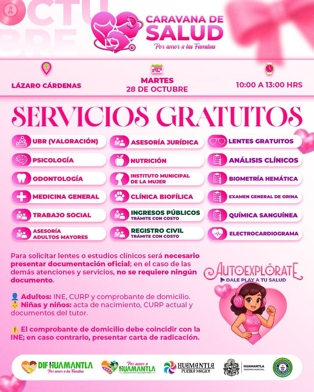 El Gobierno Municipal de Huamantla, a travรฉs del Sistema Municipal para el Desarrollo Integral de la Familia (SMDIF), invita a la ciudadanรญa a participar en la Caravana de la Salud, que se llevarรก a cabo este martes 28 de octubre, de 10:00 a 13:00 horas, en la comunidad de Lรกzaro Cรกrdenas.