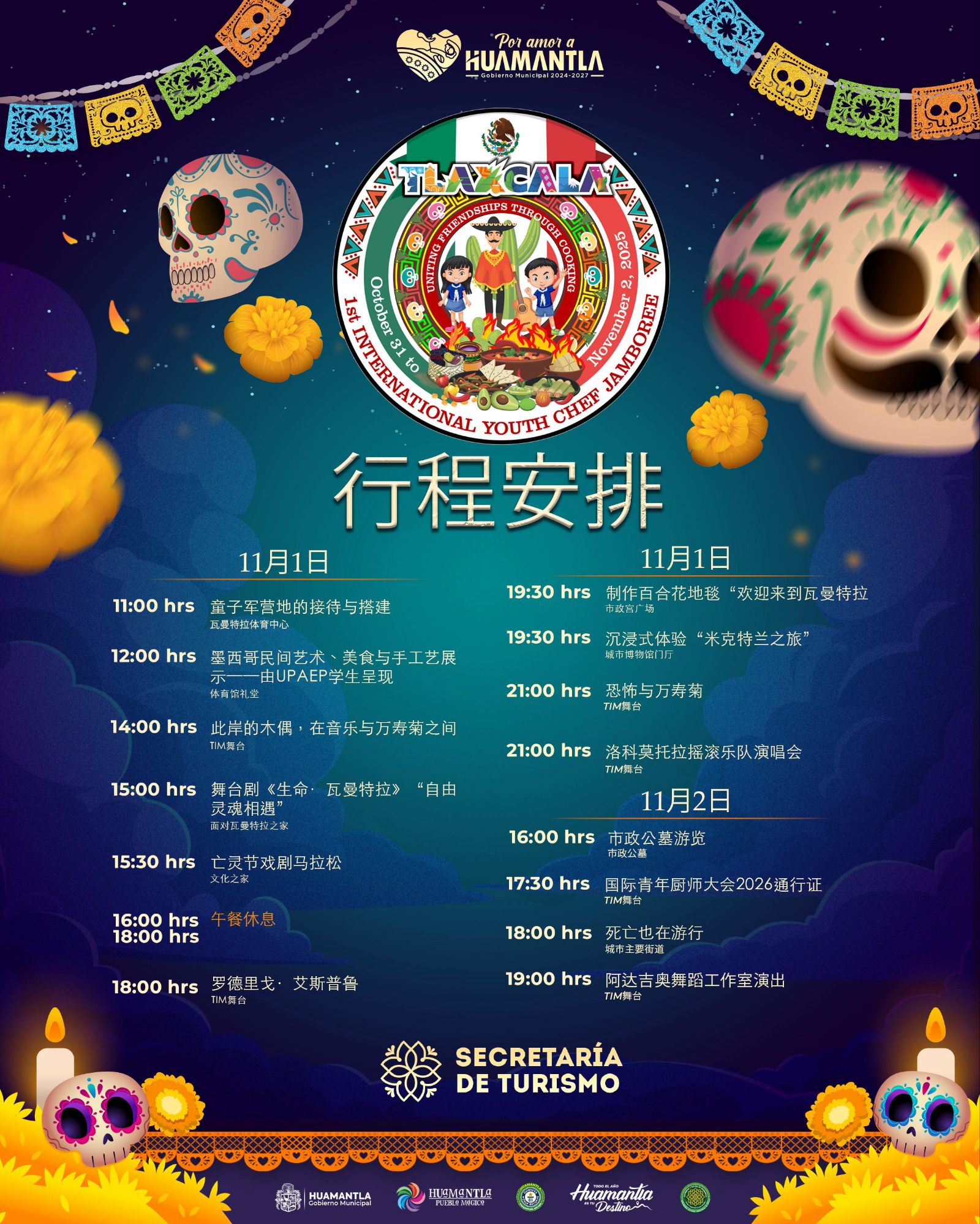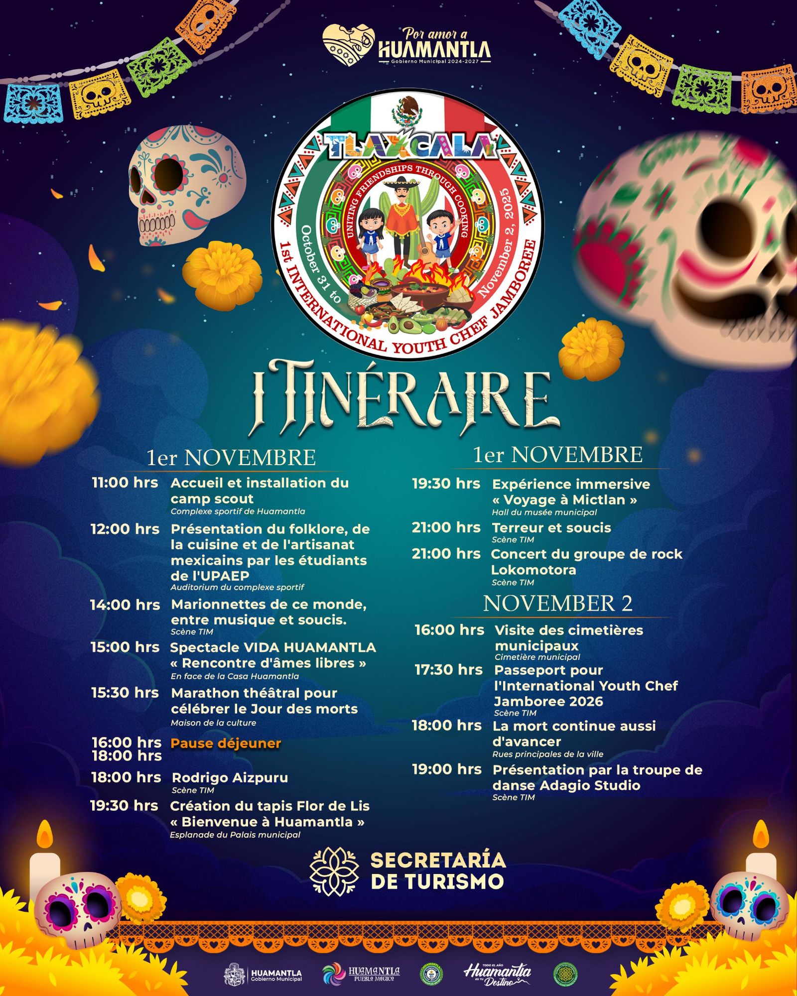 El gobierno municipal de Huamantla, que preside Salvador Santos Cedillo, dio a conocer el itinerario oficial del International Youth Chef Jamboree 2025, evento internacional del Movimiento Scout Mundial que tendrΓ‘ como sede de apertura al Pueblo MΓ‘gico de Huamantla del 1 al 2 de noviembre de 2025.