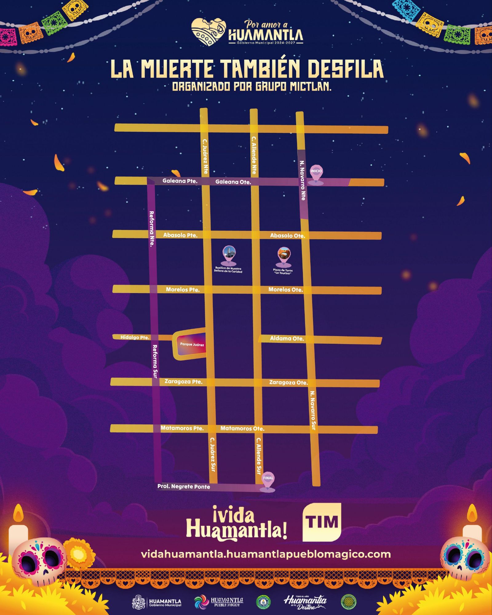El Gobierno Municipal de Huamantla 2024–2027 informa que este 2 de noviembre concluyen las actividades del Festival Vida Huamantla, una celebración que a lo largo de varios días reunió a familias huamantlecas, visitantes nacionales e internacionales en torno al arte efímero, la cultura, la música y las tradiciones del Día de Muertos.