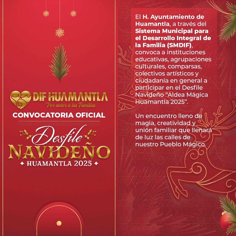 El Sistema Municipal para el Desarrollo Integral de la Familia (SMDIF) de Huamantla continua con la recepciรณn de inscripciones de la convocatoria para el esperado Desfile Navideรฑo de la Quinta Ediciรณn de Aldea Mรกgica 2025, que se llevarรก a cabo el prรณximo sรกbado 6 de diciembre, evento que busca resaltar las tradiciones locales, fomentar la creatividad, promover los valores y la identidad cultural de nuestro municipio en la temporada navideรฑa, asรญ como atraer turismo.