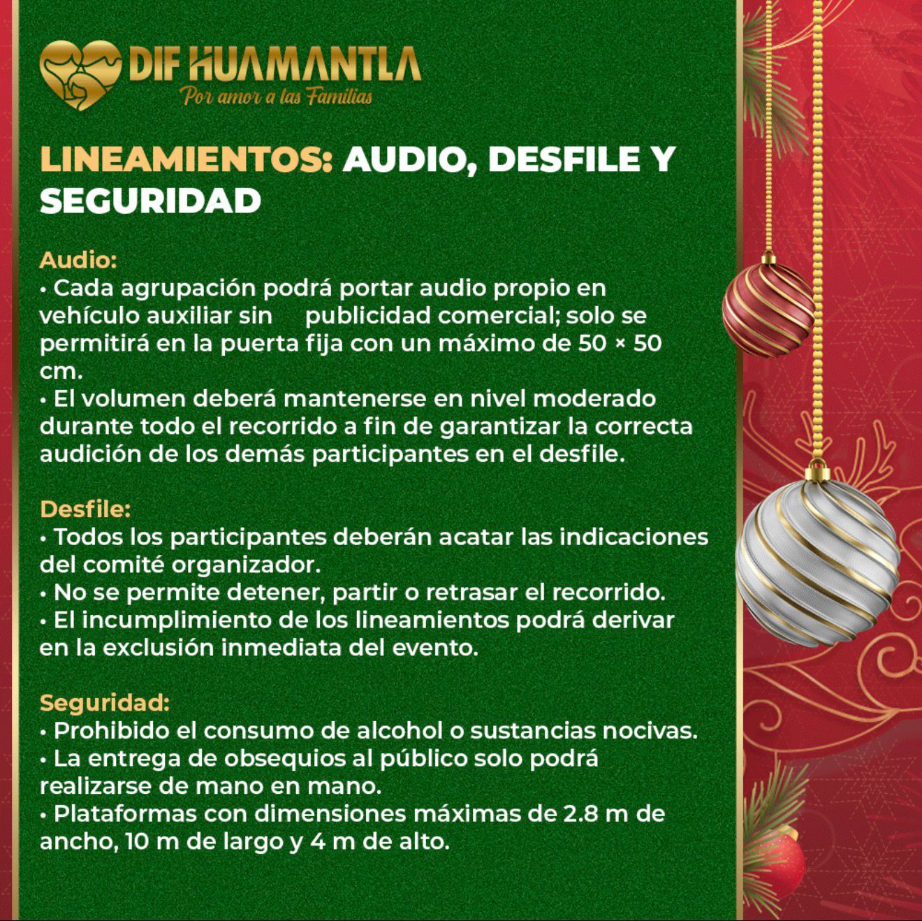 Es importante destacar que las unidades que participen deben ajustarse a ciertas especificaciones de audio y seguridad. Cada agrupaciรณn podrรก portar audio propio, el volumen deberรก mantenerse en nivel moderado durante todo el recorrido. Se prohรญbe el consumo de alcohol o sustancias nocivas. Ademรกs, las unidades deberรกn cumplir con las siguientes medidas mรกximo de 2.8 metros de ancho, una longitud de 10 metros y una altura mรกxima de 4 metros.