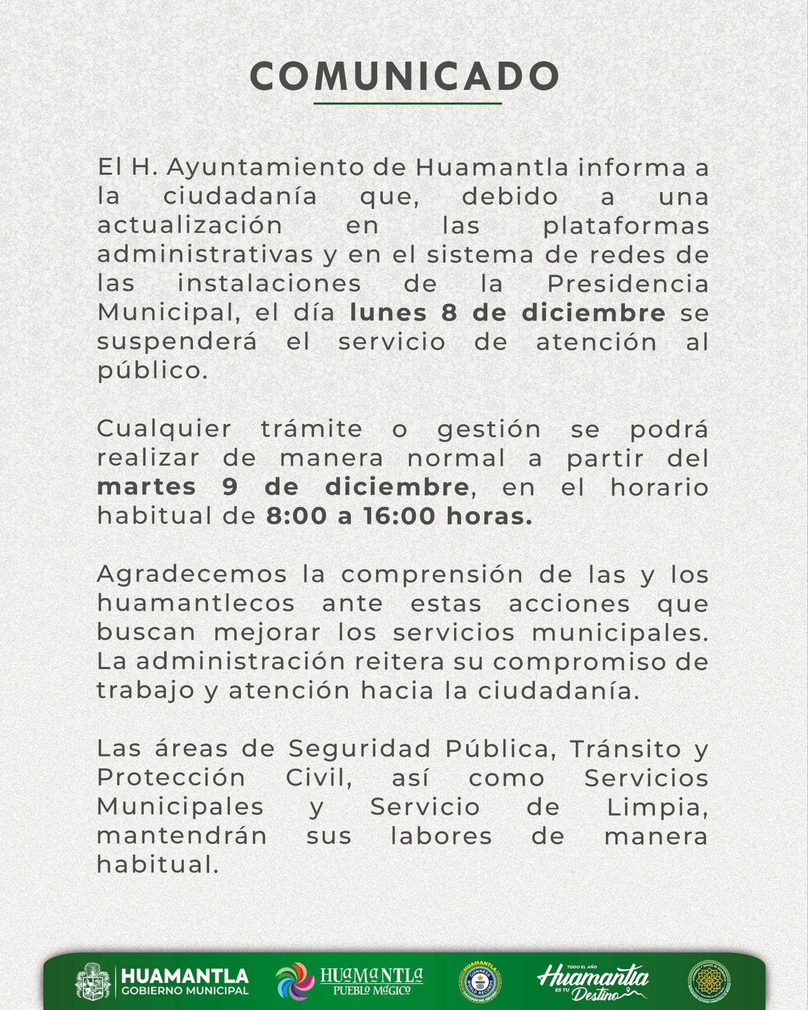 El H. Ayuntamiento de Huamantla informa a la ciudadan铆a que, debido a una actualizaci贸n en las plataformas administrativas y en el sistema de redes de las instalaciones de la Presidencia Municipal, el d铆a lunes 8 de diciembre se suspender谩 el servicio de atenci贸n al p煤blico.
