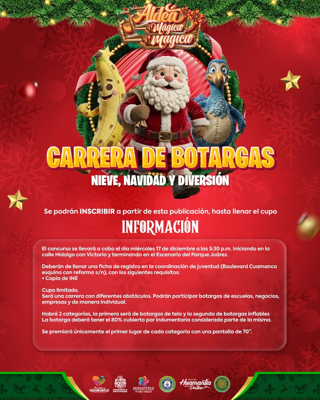08/12/2025| El Gobierno Municipal de Huamantla, que encabeza Salvador Santos Cedillo, a travรฉs de la Coordinaciรณn de Juventud, invita a escuelas, negocios, empresas y ciudadanรญa en general a participar en la tradicional Carrera de Botargas โNieve, Navidad y Diversiรณnโ, que se realizarรก el miรฉrcoles 17 de diciembre a las 5:30 p.m.