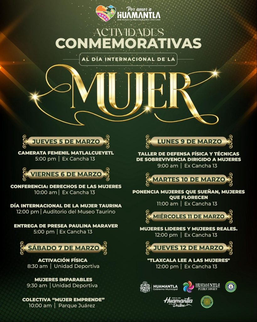 En el marco del Día Internacional de la Mujer, el Gobierno Municipal de Huamantla, encabezado por el presidente municipal Salvador Santos Cedillo, ha preparado una agenda de actividades culturales, académicas, deportivas y de reconocimiento que se desarrollarán del 5 al 12 de marzo, con el objetivo de visibilizar, reconocer y fortalecer el papel fundamental de las mujeres en la sociedad.