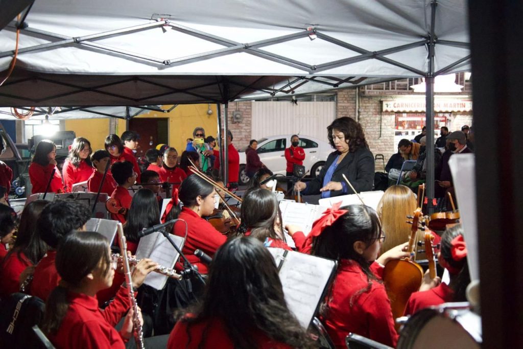 La música de la Orquesta Sinfónica Infantil y Juvenil fue la encargada de amenizar el encuentro, en el que niñas, niños y adolescentes demostraron su talento en la ejecución de diversos instrumentos, llenando el ambiente de entusiasmo y captando la atención de los asistentes.