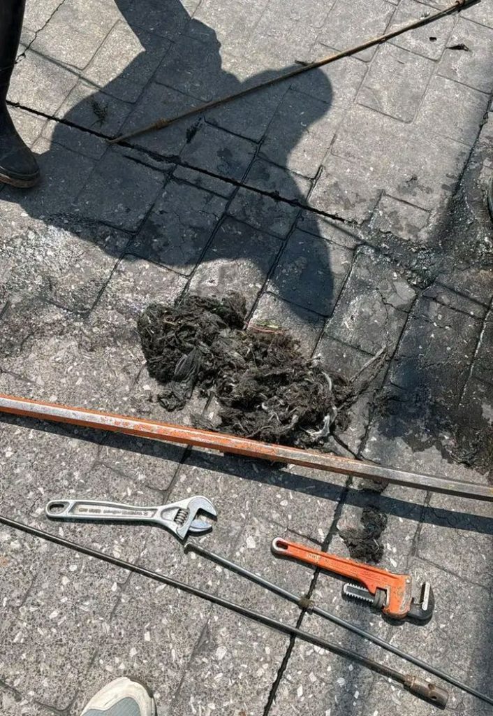 Durante las labores se detect贸 un tap贸n de grasa y desechos, por lo que personal de CAPAMH trabaja en su retiro para restablecer el correcto funcionamiento del drenaje.