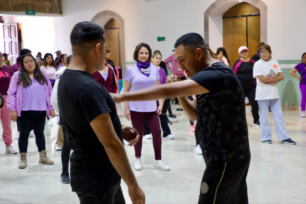 Posteriormente, en el Auditorio Ex Cancha 13, personal especializado de la Guardia Nacional impartió el curso de defensa personal, donde las asistentes recibieron herramientas y técnicas prácticas orientadas a fortalecer su seguridad, confianza y capacidad de reacción ante posibles situaciones de riesgo.