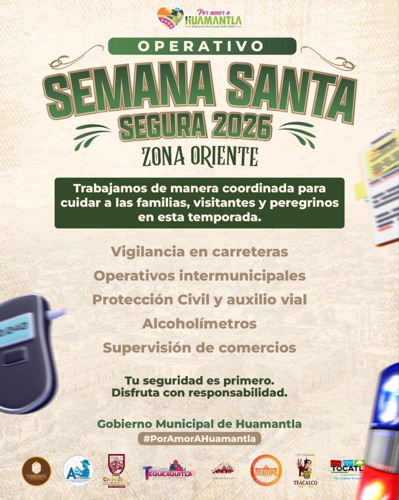 Con el objetivo de salvaguardar la integridad de las familias huamantlecas y de quienes visitan el municipio durante esta temporada, el Gobierno Municipal de Huamantla ha puesto en marcha el operativo “Semana Santa Segura”, en coordinación con municipios de la zona oriente.