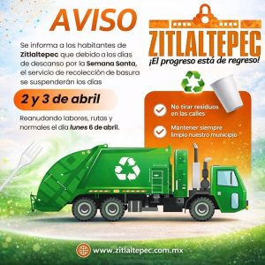 Se les informa que el servicio de recolección de basura será suspendido los días 2 y 3 de abril con motivo de la celebración de Semana Santa. El servicio se reanudará el lunes 6 de abril en su horario habitual.