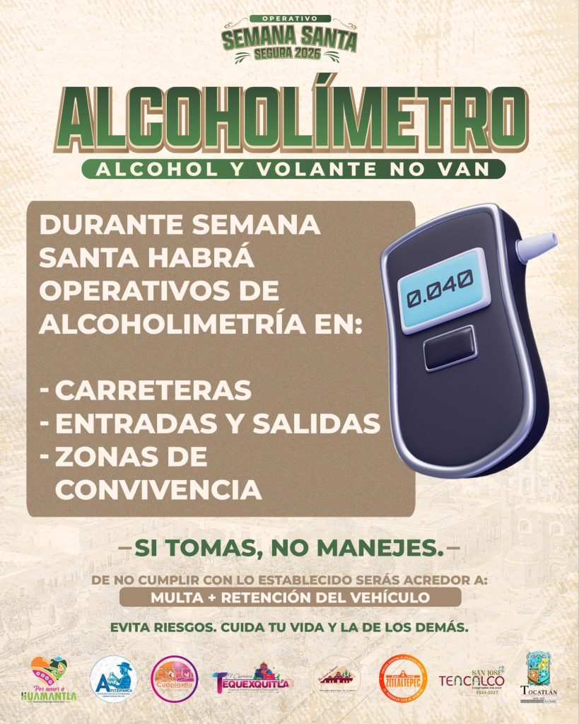 Huamantla, Tlaxcala.- Como parte del operativo coordinado “Semana Santa Segura 2026”, autoridades de la zona oriente del estado implementaron puntos de control con alcoholímetro en diferentes ubicaciones estratégicas, con el objetivo de prevenir accidentes y salvaguardar la integridad de la población.
