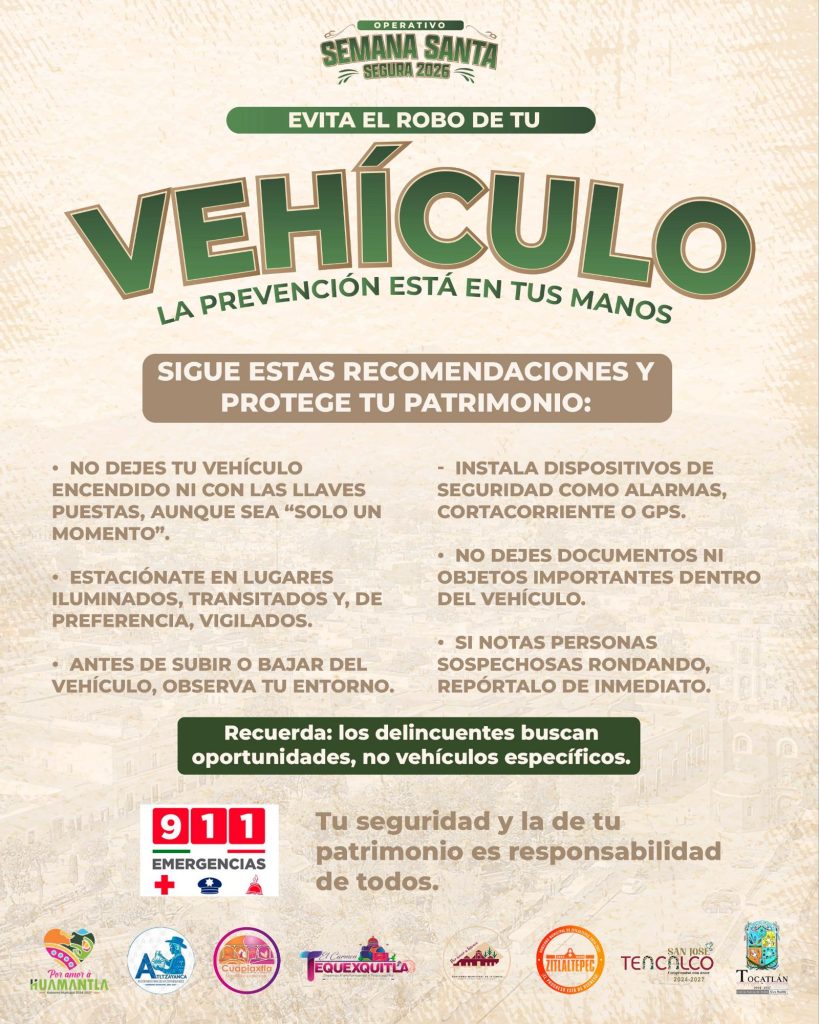 Huamantla, Tlax., a 03 de abril de 2026.– Como parte de las acciones del operativo “Semana Santa Segura 2026” en la zona oriente del estado, autoridades de los tres órdenes de gobierno emitieron una serie de recomendaciones dirigidas a la ciudadanía para prevenir el robo de vehículos durante este periodo vacacional.