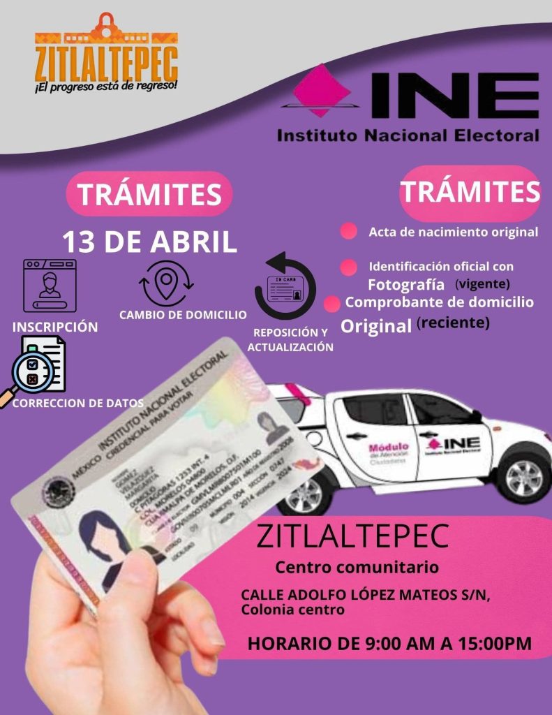 El Ayuntamiento de Zitlaltepec informa a la ciudadanía que el módulo del INE estará brindando atención el próximo lunes 13 de abril de 2026, en las instalaciones del Centro de Desarrollo Comunitario, en un horario de 9:00 de la mañana a 3:00 de la tarde.